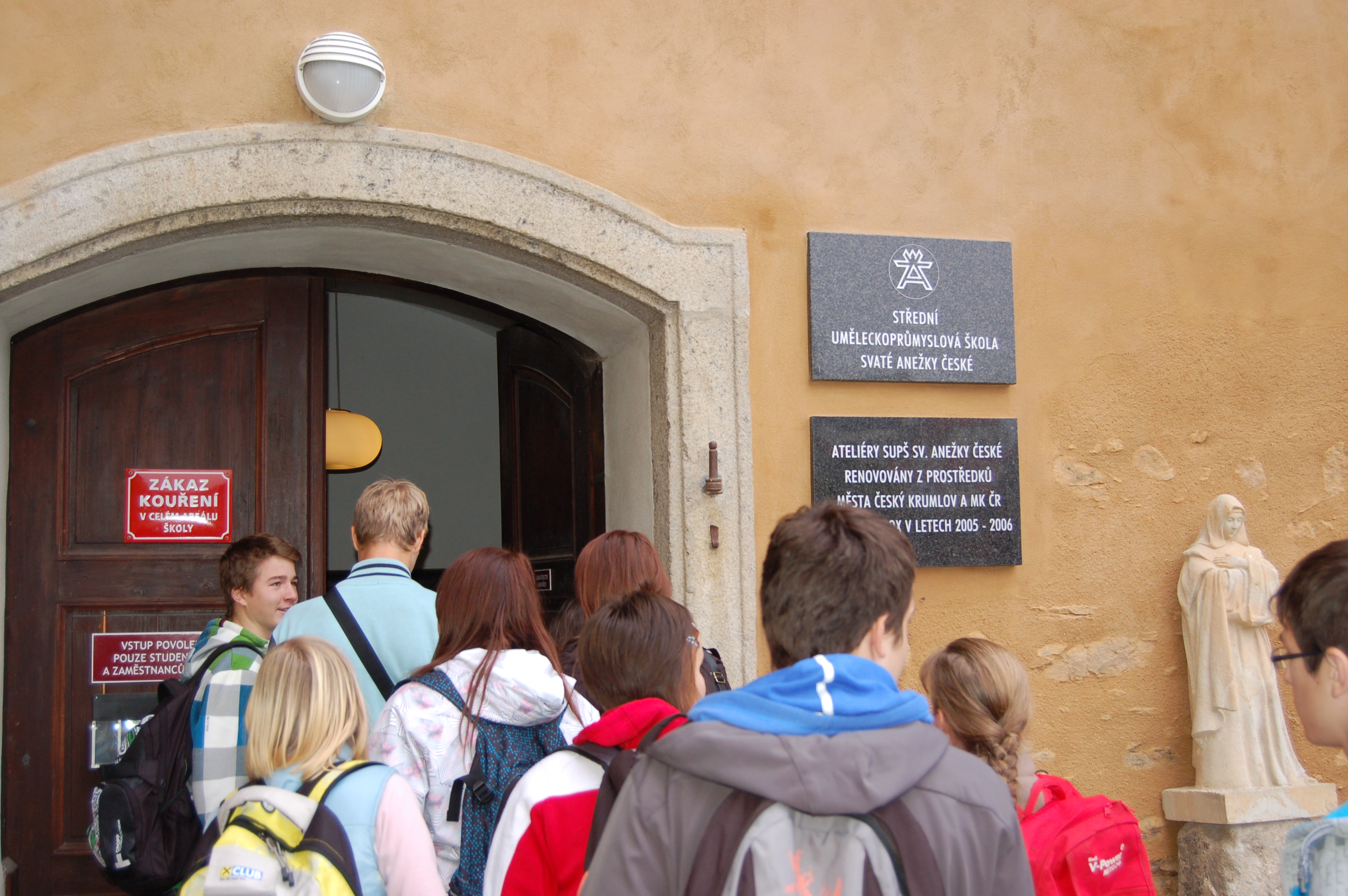 Po obědě jsme se potkali s devátou třídou a společně se vydali navštívit uměleckou školu Sv. Anežky. Viděli jsme kreslírny, dílny a dokonce i studenty přímo v akci. Škola má dvě odloučené budovy, takže jsme si stihli cestou mezi nimi i prohlédnout město. Nejvíce nás zaujaly vystavené práce na chodbách školy a kamenosochařská dílna.