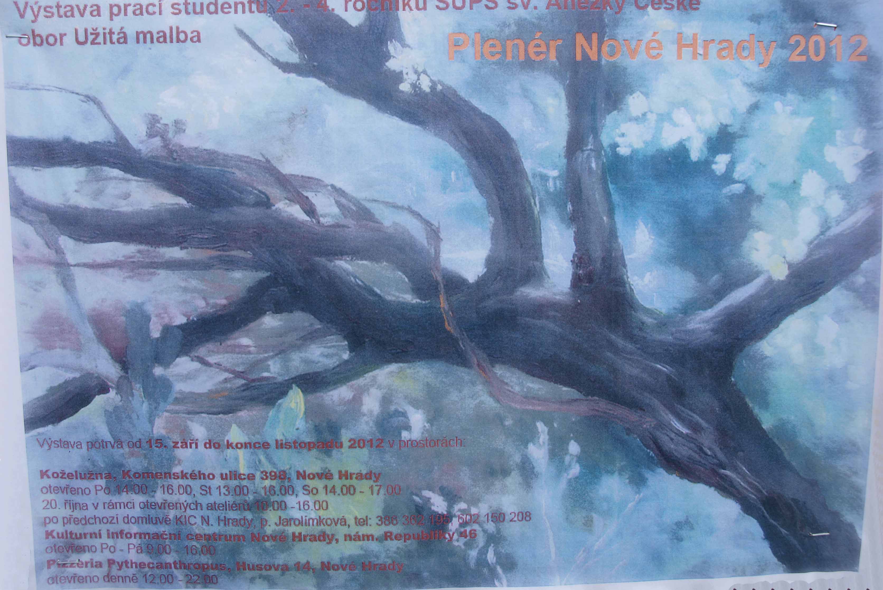 Výstavu uspořádali studenti SUPŠ sv. Anežky České v Českém Krumlově. Ti absolvovali v našem městě kurs malby a kresby v plenéru (plenér = krajina). Bohužel, většinu svých obrazů si odvezli s sebou, k vidění bylo několik krajinomaleb z našeho okolí – Terčino údolí, vodopád, vodojem. Výstava probíhá ve dvou budovách, v Koželužně jsou umístěny krajinomalby, na informačním centru kresby.